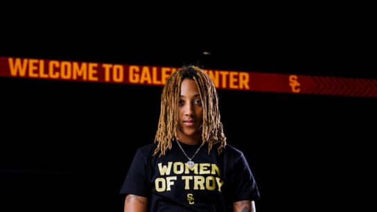 Near the end of this Trojan train, sporting grey sweatpants and casually walking is redshirt freshman, Aaliyah Gayles. She breaks out into a slow, nonchalant jog, high-fiving a couple of young fans as she nears the court and then proceeds to plant her Nike Dunk Low sneakers, one after the other, onto the hardwood and follow her teammates to the opposite basket.