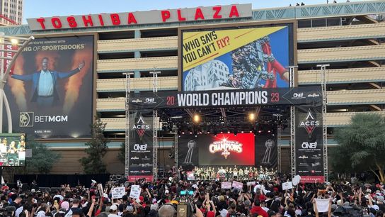 LAS VEGAS -- The two-time WNBA champion Las Vegas Aces sequestered a small portion of Las Vegas Boulevard and Toshiba Plaza outside of T-Mobile Arena on Monday night, as they celebrated their second championship with Southern Nevada.