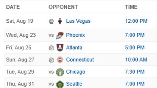 The Sparks close out the regular season with a three-game road trip. On September 5th, they go back to Connecticut. Two days after, they'll have their work cut out for them against an increasingly terrifying New York Liberty squad. Then on the last game of the regular campaign, the Sparks face the Storm on September 10th.
