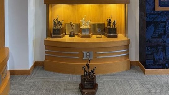 Next, the trophy visited the Duke Basketball Museum, where it had the chance to see the past winners' trophies awarded to Christian Laettner (1992), Elton Brand (1999), Shane Battier (2001 - 25th Anniversary silver trophy), Jason Williams (2003), J.J. Redick (2006), and Zion Williamson (2019).