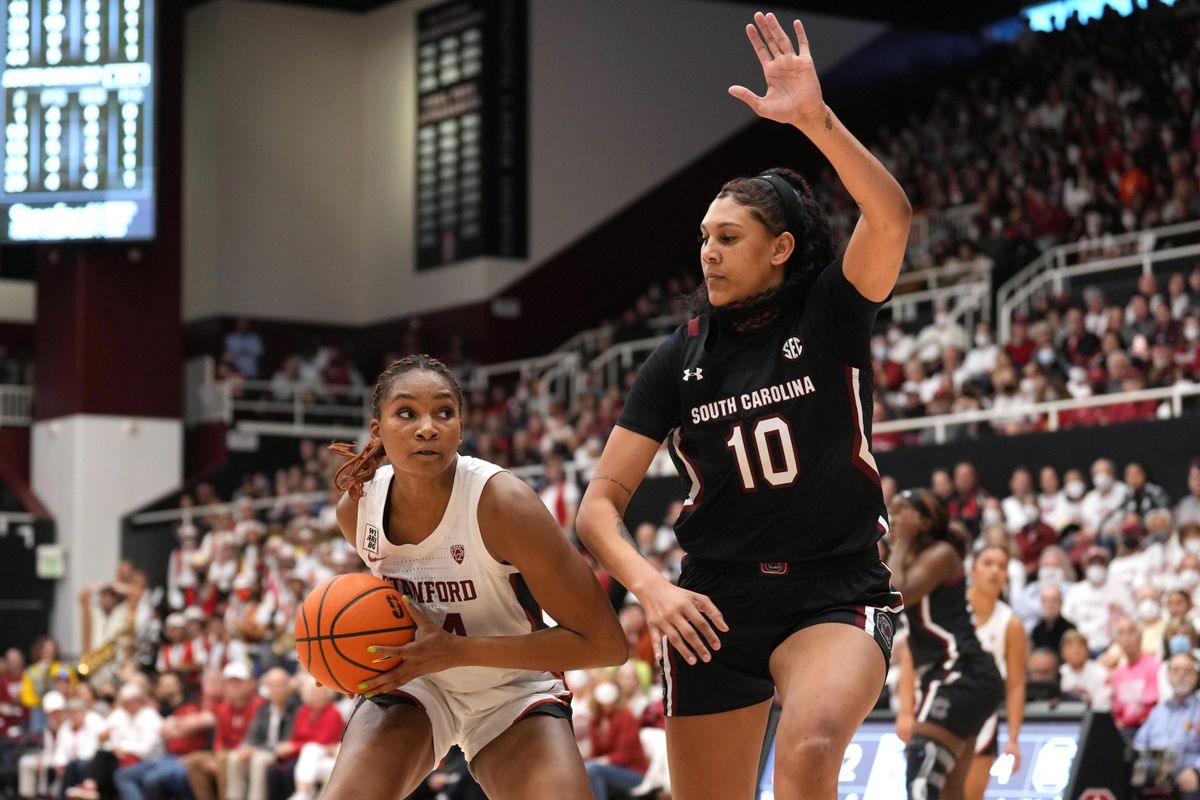Nov 20, 2022; Stanford, California, USA; Stanford Cardinal forward Kiki Iriafen (44) handles the ball against South Carolina Gamecocks center Kamilla Cardoso (10) during the third quarter at Maples Pavilion.
