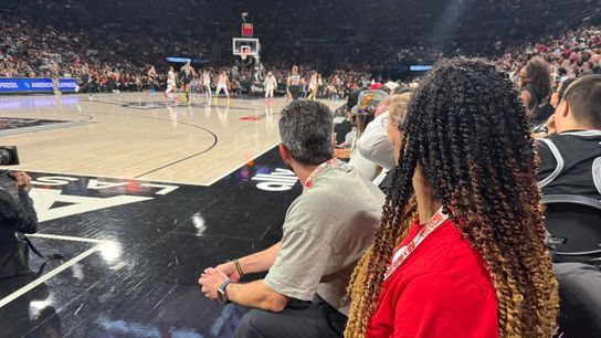 Kinsey Minter (l) and Heiden Ratner sit courtside during Game 1 of the 2025 WNBA Finals, not too long after serving at chapel to players from the Aces and Mercury.