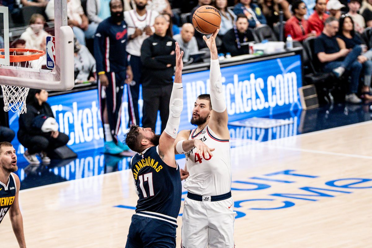 Los Angeles Clippers C Ivica Zubac (40) shoots a hook shot over the defender during an NBA pre-season basketball game against the Denver Nuggets, Sunday October 12th, 2025 in Inglewood, California.