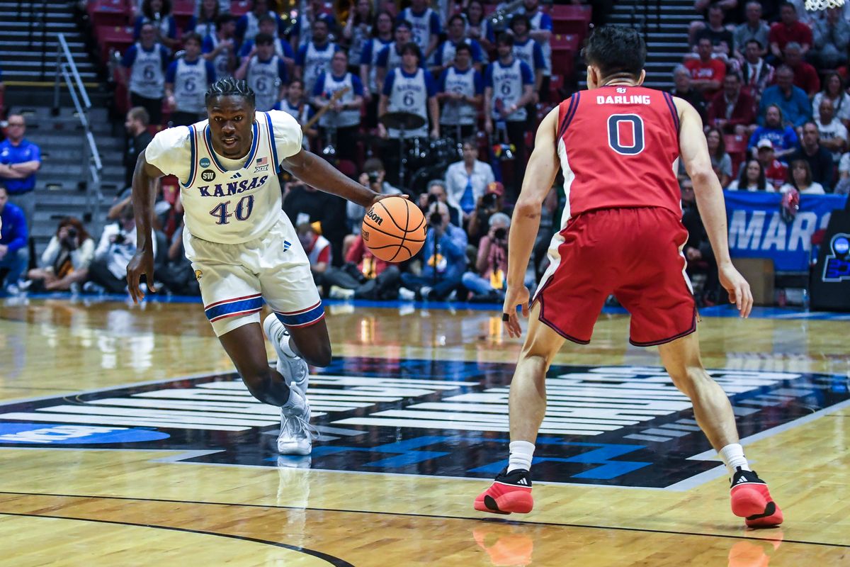 Kansas guard Melvin Council Jr. (14) dribbles the ball during an NCAA East Region second round game against St. John’s Sunday March 22, 2026 in San Diego, California.