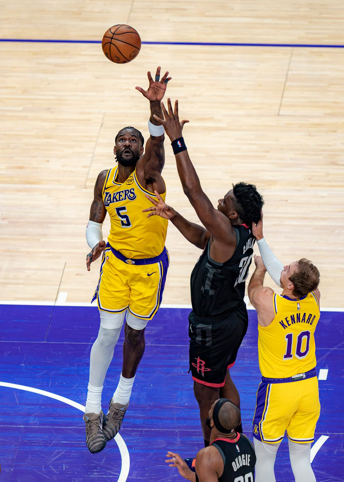 Los Angeles Lakers center Deandre Ayton (5) dunking during an NBA basketball game against the Houston Rockets on April 18th, 2026 in Los Angeles, CA.