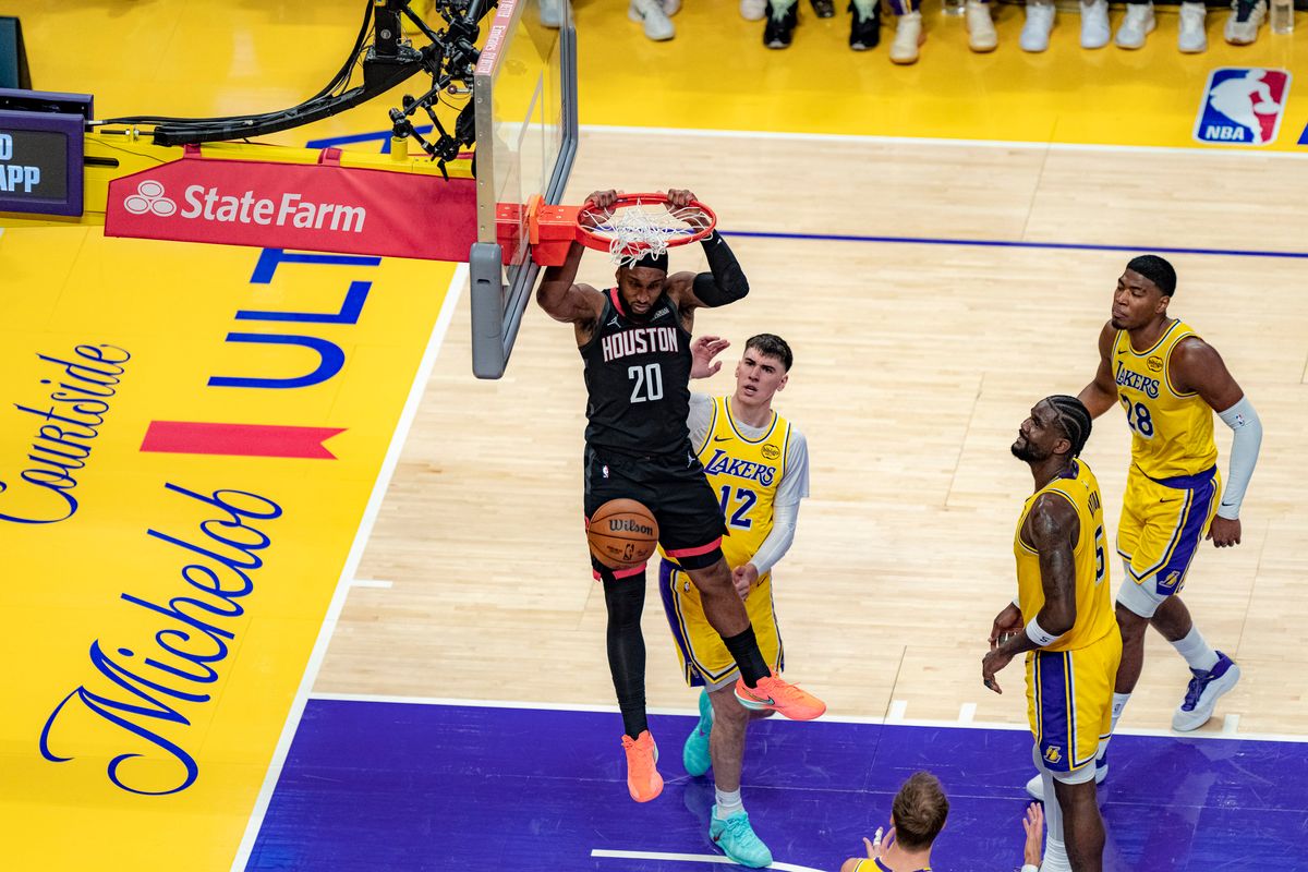 Houston Rockets forward Jabari Smith Jr. (10) leaps for a dunk during an NBA basketball game against the Los Angeles Lakers on April 18th, 2026 in Los Angeles, CA.