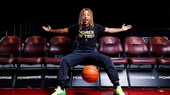Near the end of this Trojan train, sporting grey sweatpants and casually walking is redshirt freshman, Aaliyah Gayles. She breaks out into a slow, nonchalant jog, high-fiving a couple of young fans as she nears the court and then proceeds to plant her Nike Dunk Low sneakers, one after the other, onto the hardwood and follow her teammates to the opposite basket.